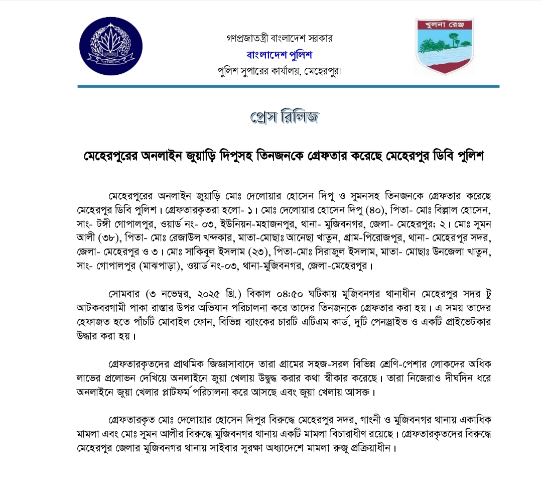 মেহেরপুরে অনলাইন জুয়াড়ি দেলোয়ার হোসেন দিপুসহ তিনজনকে গ্রেফতার করেছে জেলা Details..