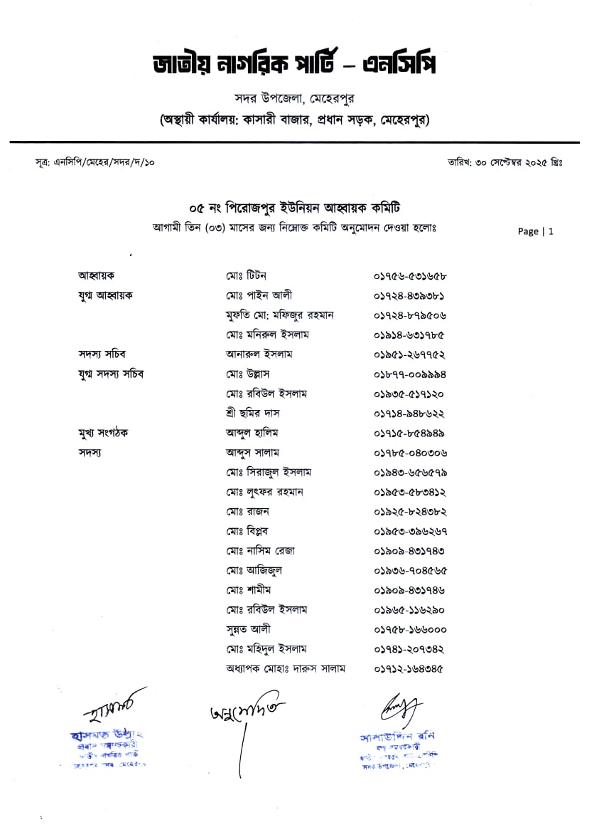 আহ্বায়ক কমিটির অনুমোদনপত্রে সদর উপজেলা এনসিপি’র সভাপতি মোহাঃ দারুল সালাম ও সাধারণ সম্পাদক মোহাঃ নাজমুল হোসেন স্বাক্ষর করেন।